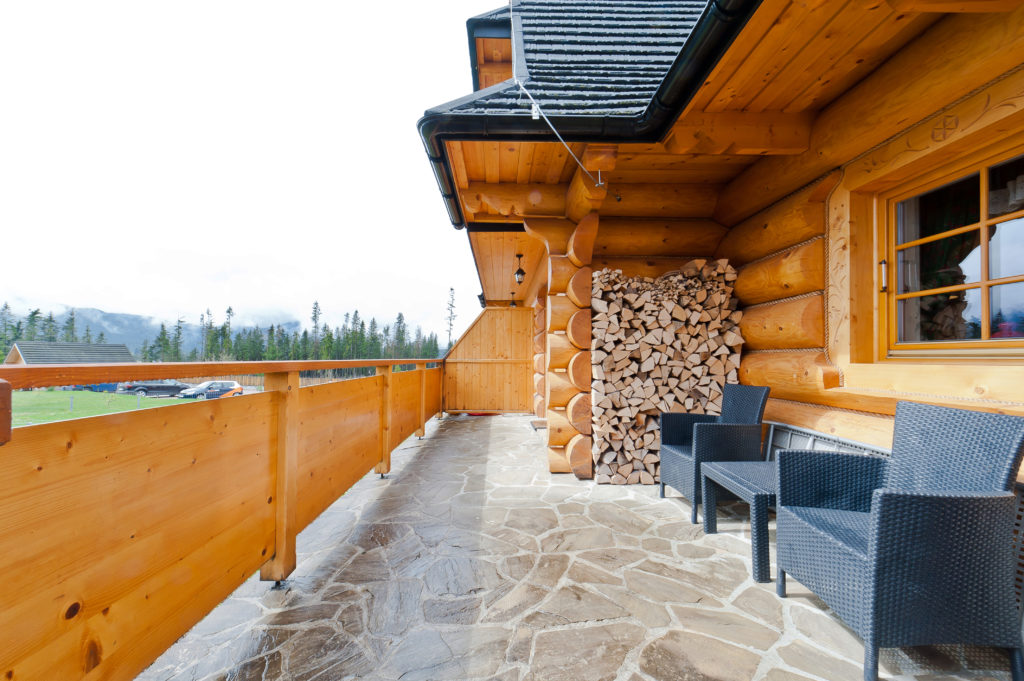 rozkládací pohovka, rozkládací křeslo, TV, stůl, židle, stůl a židle do práce, terasa, krb.