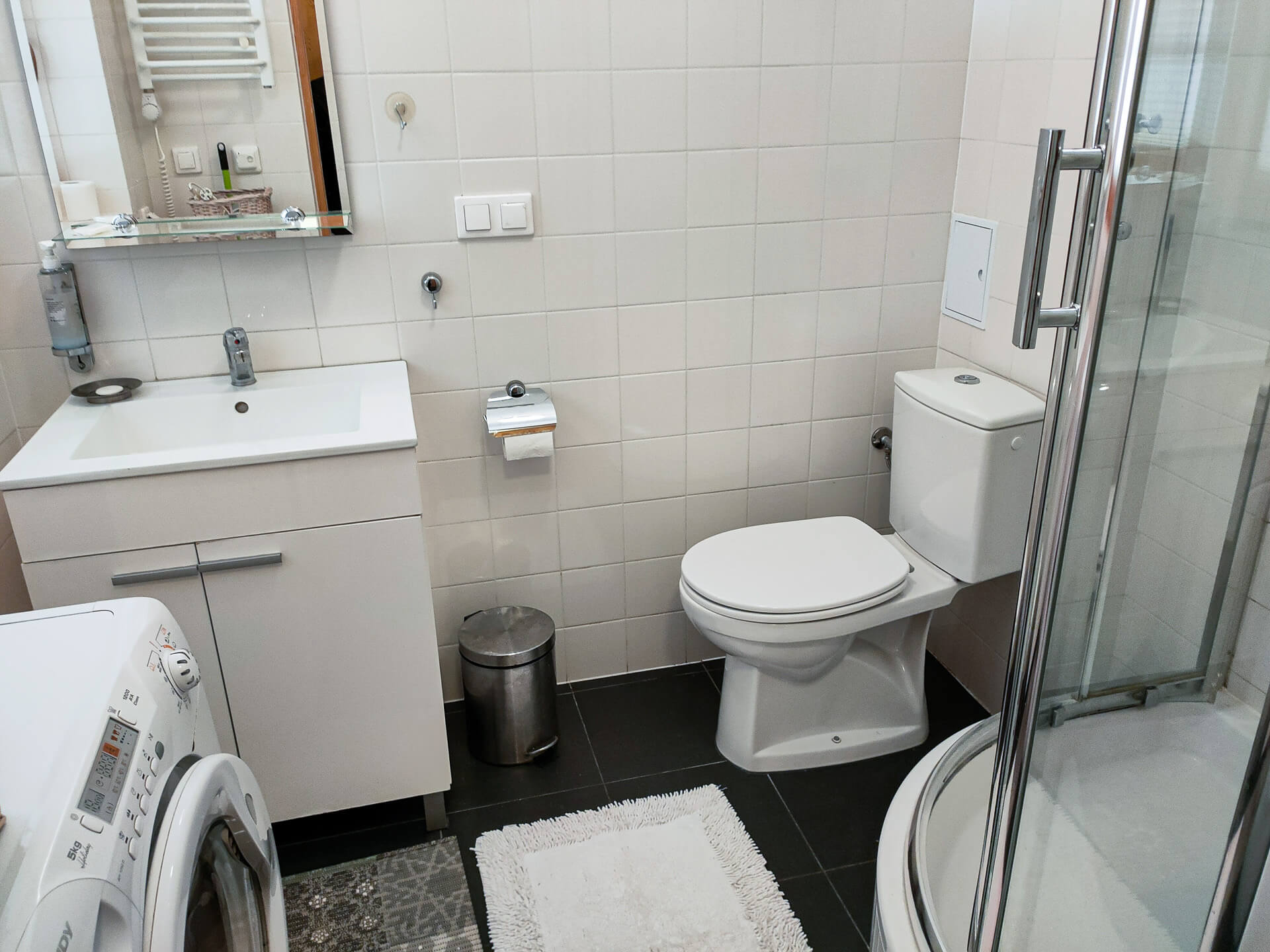 sprchový kout, umyvadlo, WC, vysoušeč vlasů, pračka, přídavné podlahové vytápění, ručníky.