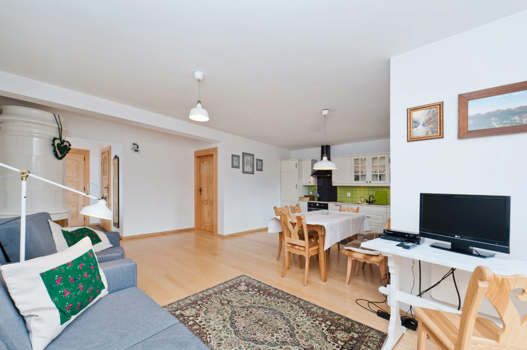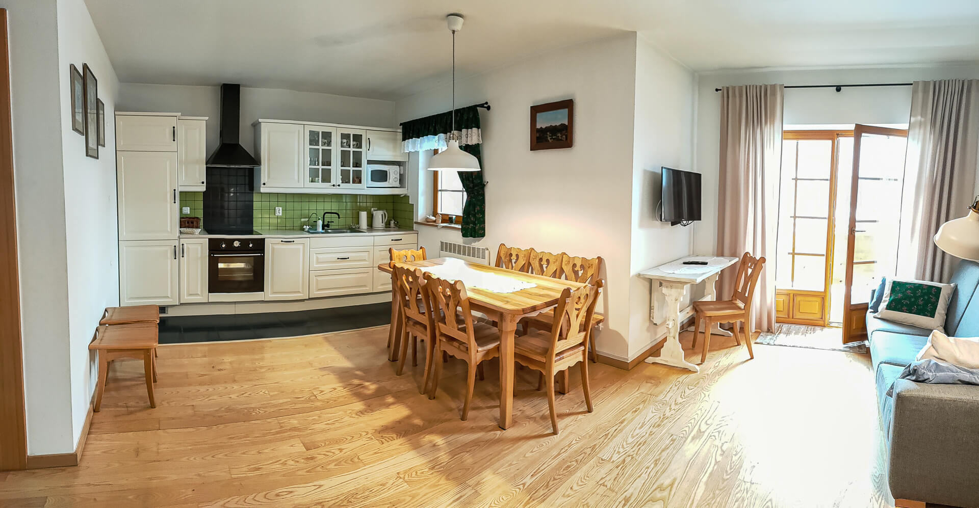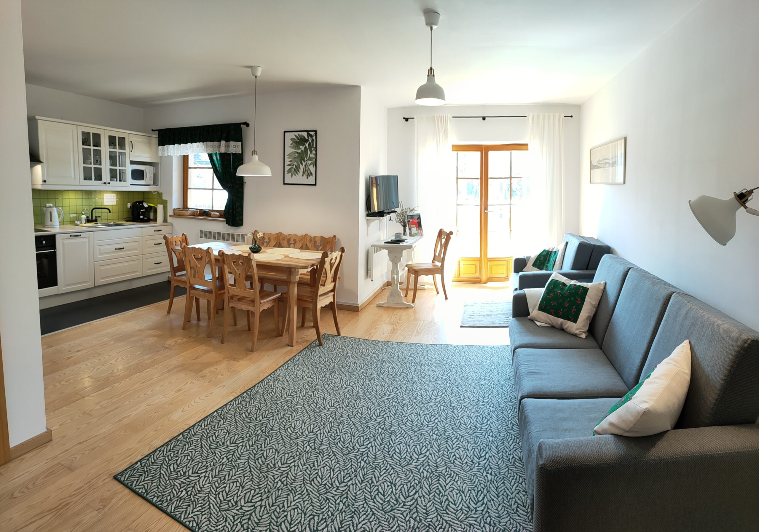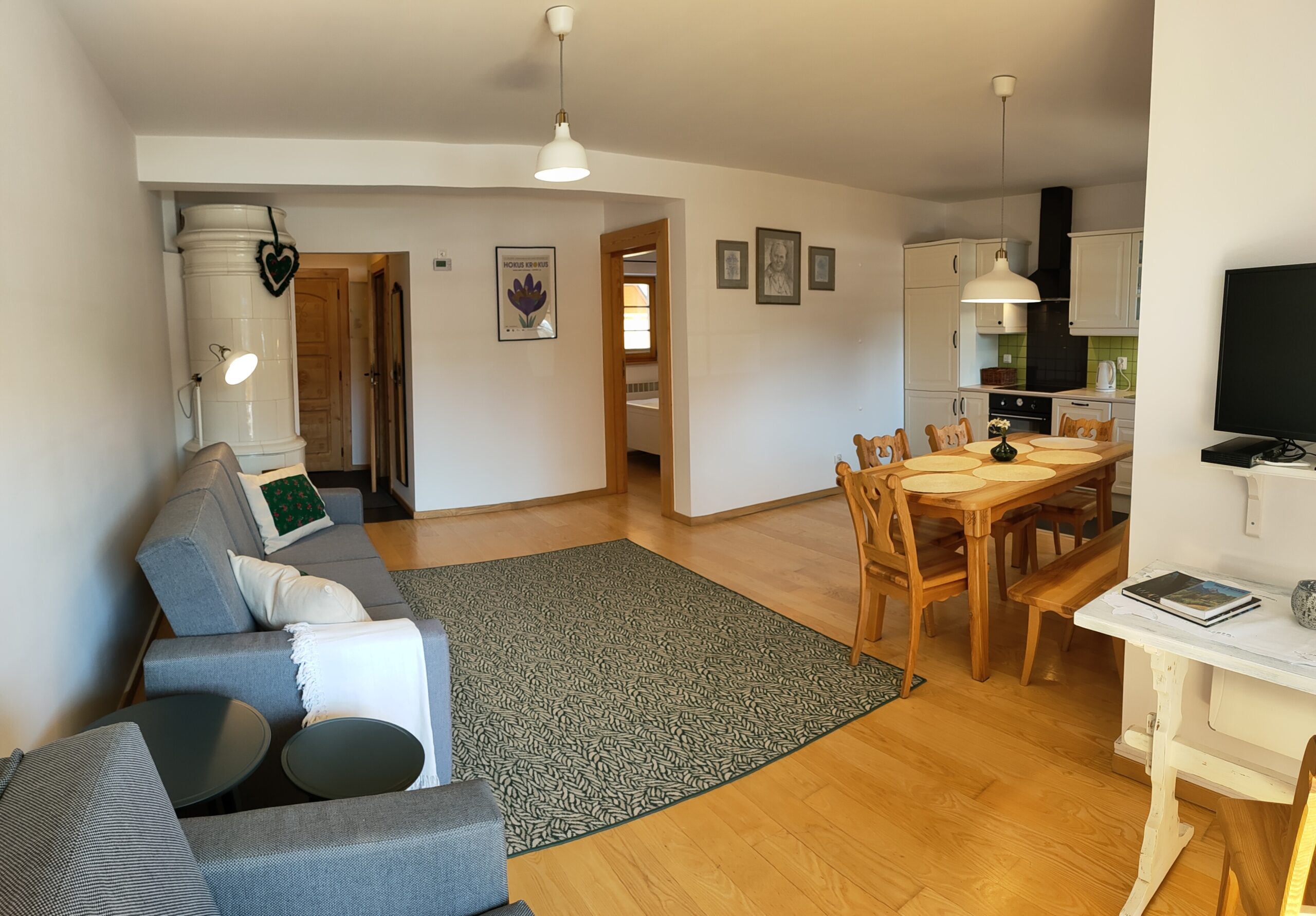 Byt POD JASIENIEM se nachází v přízemí v domě ve stylu horalů, má samostatný vchod, vlastní terasu a zahradu. Prostorný obývací pokoj s kuchyňským koutem a přímým vstupem na terasu, útulná ložnice a koupelna.